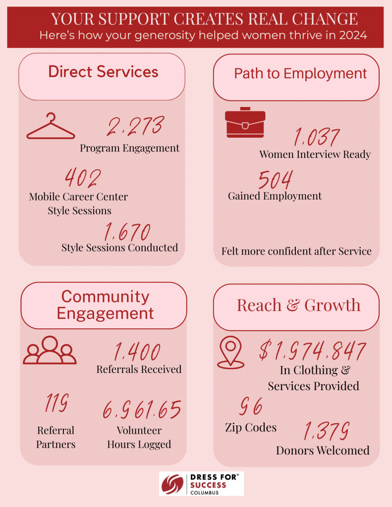 Since Dress for Success Columbus opened it’s doors in 2007, we have been a part of thousands of women’s journeys to empowerment and self-sufficiency. Our work is fueled by the power of our community and we are grateful for each donor who has donated a pair of shoes, a suit or financially. You are the power that fuels change, creates opportunity and helps move women forward.