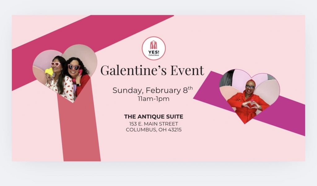 Come join us for our annual Galentine’s Event at The Antique Suite by Allure Events! Grab your favorite gals (or guys!) and join us to mingle, enjoy lite brunch + dessert bites, drink up at a mimosa bar, shine with hair tinsel, take photos with your pals, and learn more about how YES! and Dress for Success Columbus support our community. All are welcome!